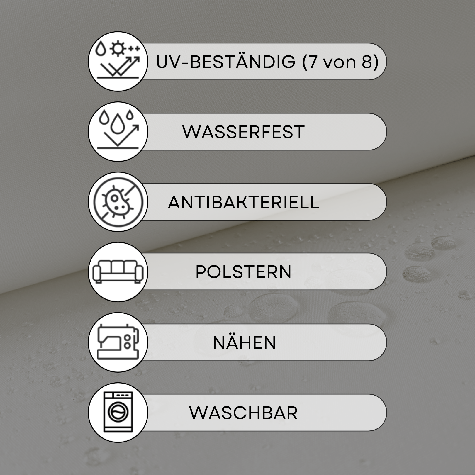 | Material | 100% Polyacryl, 100% Polyacryl + Resin-Beschichtung |