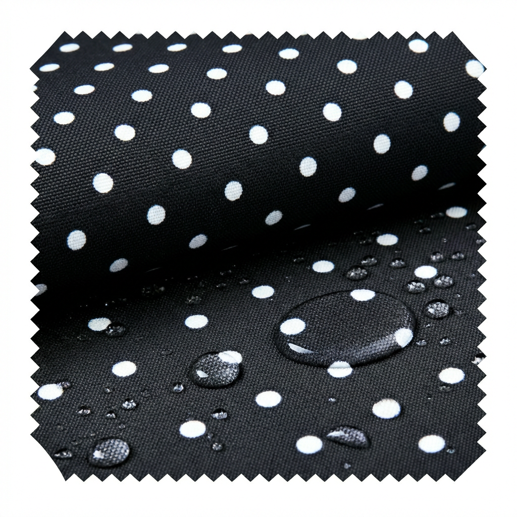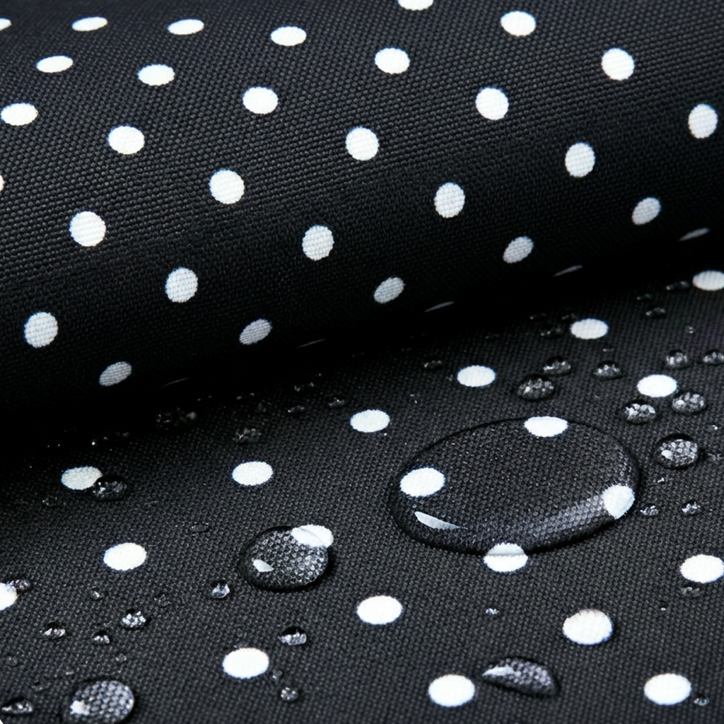 Bedruckter Polyesterstoff mit wasserabweisender PU-Beschichtung.